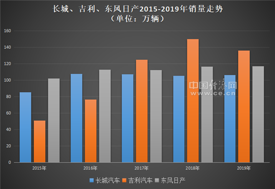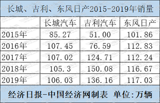 以长城和东风日产近年来的市场表现为例:2016年,长城汽车首次年销超百万辆至107.45万辆,此后几年维持在这一水平;2017年销售107.02万辆,出现小幅下滑;2018年降至105.30万辆、2019年销量为106.03万辆。东风日产境况相似,2015年,东风日产以101.86万辆的成绩正式跨越百万辆门槛,随后,2016年销售112.83万辆,2017年112.24万辆,2018年116.67万辆,2019年117.03万辆,稳健有余但增势缓慢。