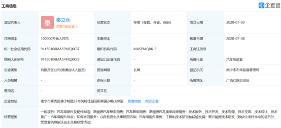 恒大新能源汽车(广西)有限公司工商信息;图片来源:企查查