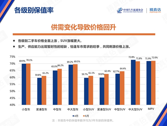 中国经济网北京6月2日讯,中国汽车流通协会和精真估联合发布了《2021年5月中国汽车保值率研究报告》。《报告》显示,今年汽车市场积累了“缺芯”“缺钢”“缺铜”等多项不利因素,多重效应叠加之下,厂商经销商难以全部承担,因此一部分新车开始涨价,二手车价格走势也与之联动。