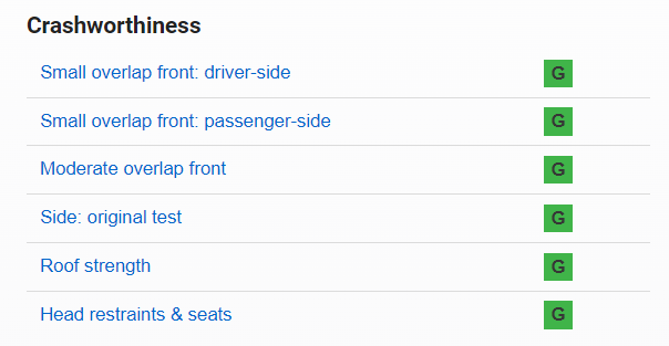 2022年的评分标准与2021年相比没有变化。所有车辆必须参加IIHS 6项耐撞性测试——驾驶员侧前方小偏置碰撞、副驾驶侧前方小偏置碰撞、正面碰撞、侧向碰撞、车顶强度和头部保护,车辆表现将根据良好(Good)、一般(Acceptable)、及格(Marginal)和差(Poor)四个级别评分。