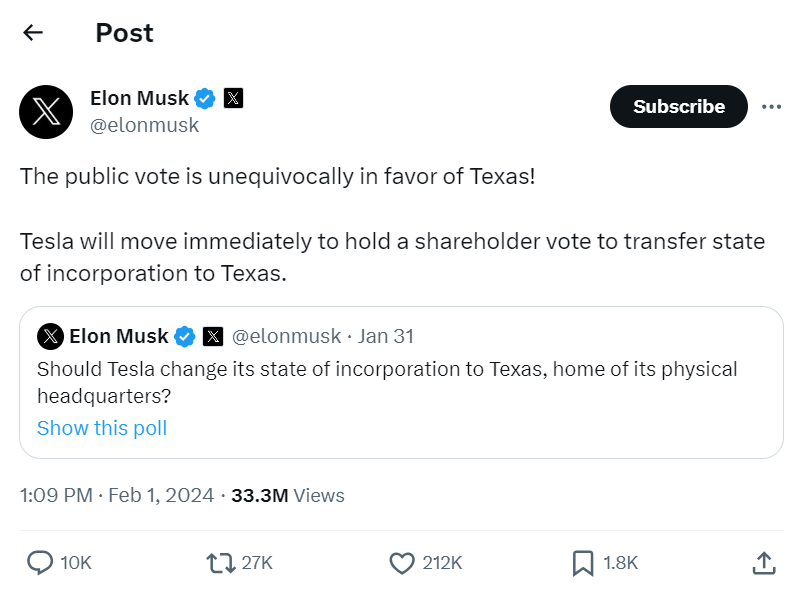 马斯克在其最新的社交媒体帖子中表示:“公众投票明确支持德克萨斯州!特斯拉将立即启动股东投票程序,以将注册地迁移至德克萨斯州。”